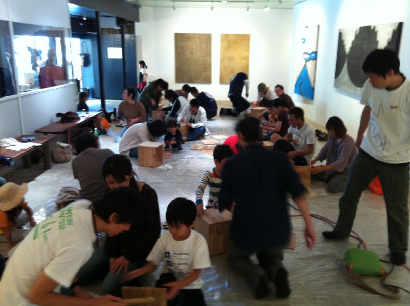 建築家、細田みぎわさんをはじめとする廃材プロジェクト「森のかけら展」のなかで、カホンプロジェクトが実演をさせていただきました。建築廃材のみをつかってのカホンづくりに3名の飛び入り参加者のかたもいっしょに6時間かけてのパフォーマンスでした。