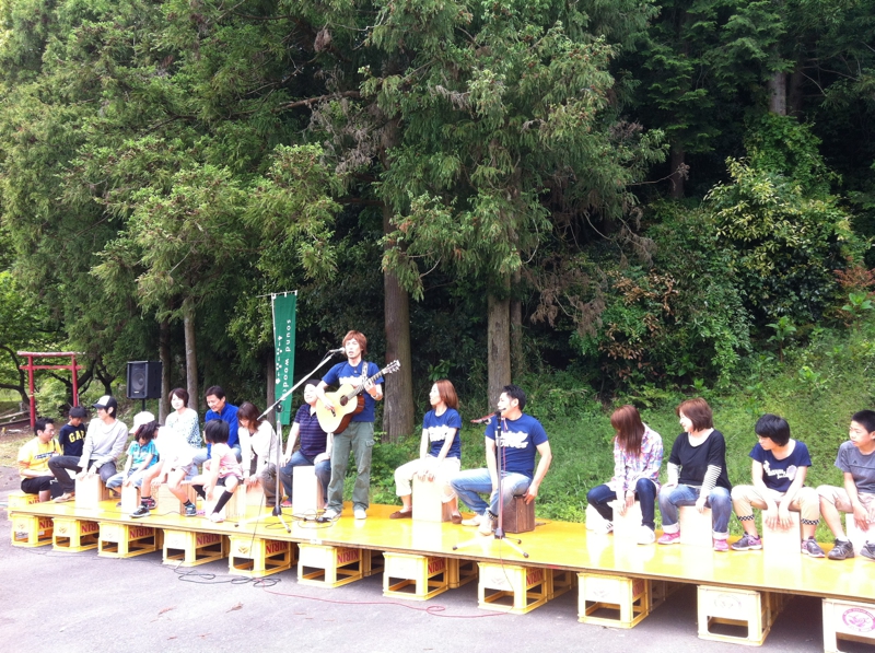 湘南の風を丹波の森におくりこんだ歌手、野崎有真。ビールケースの舞台でカホンづくりに参加してくれたみんなが大合奏。