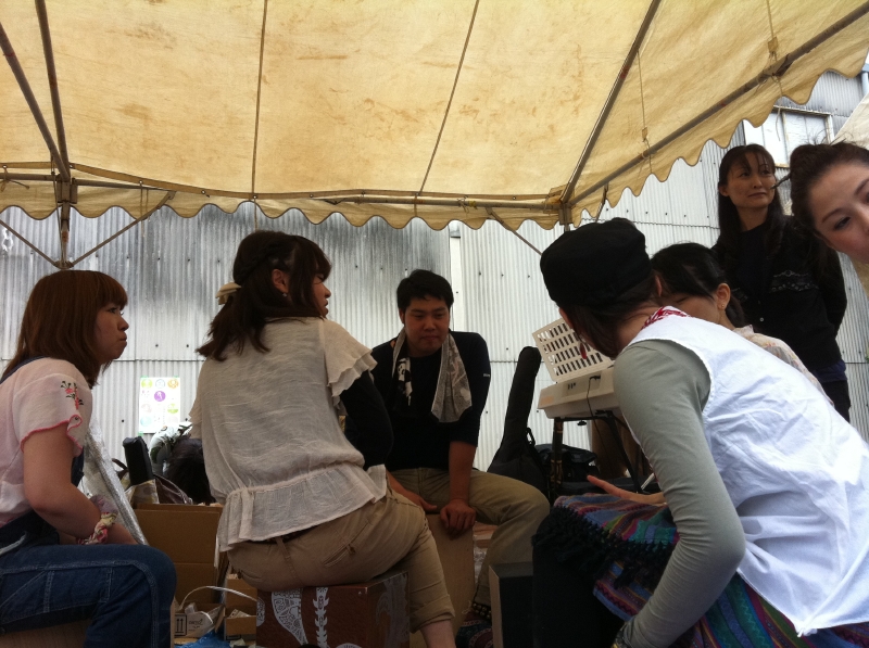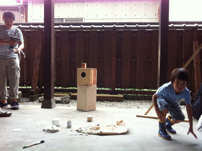 2日目は、朝は小雨だったので野外のテントからスタート。参加者があっというまに定員オーバー。合計13名の方々にカホンづくりを楽しんでもらいましたよー。この日は、保育士さんの助っ人、ピアノとフルートでセッションしました。大人も子供もみんなで叩いて、空き缶やホウキなども使ってワーワーやりました。