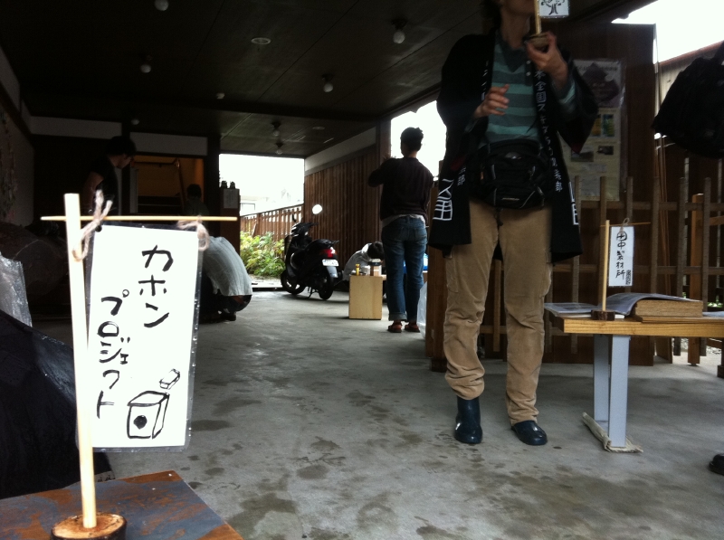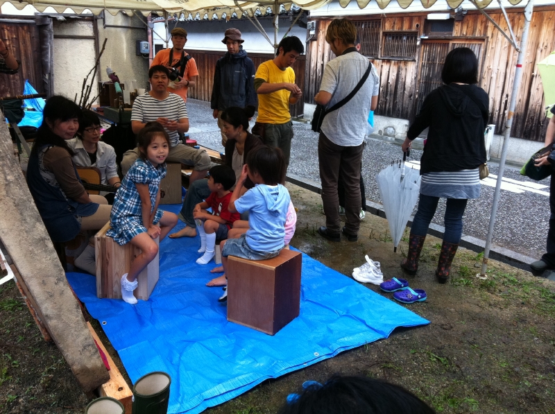富田林市の寺内町界隈で、青空の下、もとい、雨中のカホンづくり&演奏会