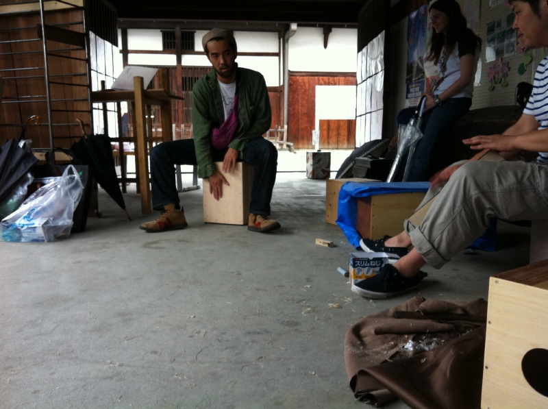 初日は、午前中から雨が降っていたので場所を集会所の駐車場に移動して屋内でのカホンづくりでした。午後からは少し雨がやんだので、演奏会は空き地にゴー。