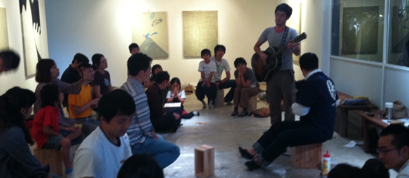 あと、福岡でミヤジックというインディーズを100組集めるという凄いイベントを主催している山内さんがかわいい娘さんと遊びに来てくれたり、みんなの森財団という東京の森をフィールドにさんまをやいたり(笑)森林ボランティアしたり活動されている堀内さん飛田さんも来てくれて、楽しいイベントになりました。もちろん、湊さん大活躍でお人柄がうかがえる人気っぷりでした。あと兵庫県立淡路景観学校の内田さんもお手伝いしてくれてわーわーな感じのワークショップでした。