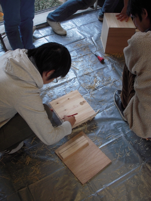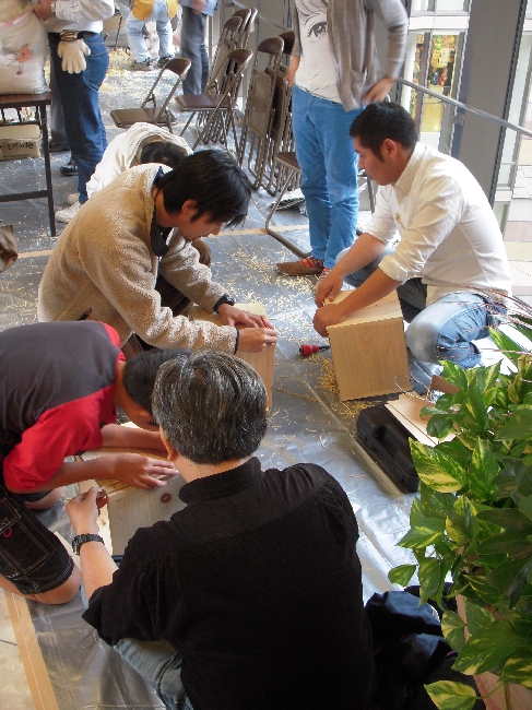 パフォーマンスを終えて一息つく暇も無くカホン作りへと。今回は、4人の方に体験いただきました。ものづくりって、サイコー。河内長野市役所のみなさん、大阪府森林組合のみなさん、ラブリーホールの方々、皆様お疲れ様でした~。