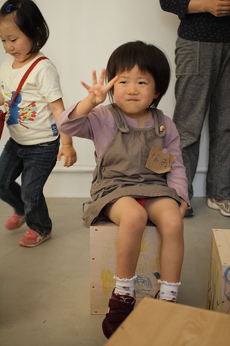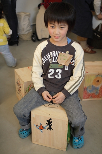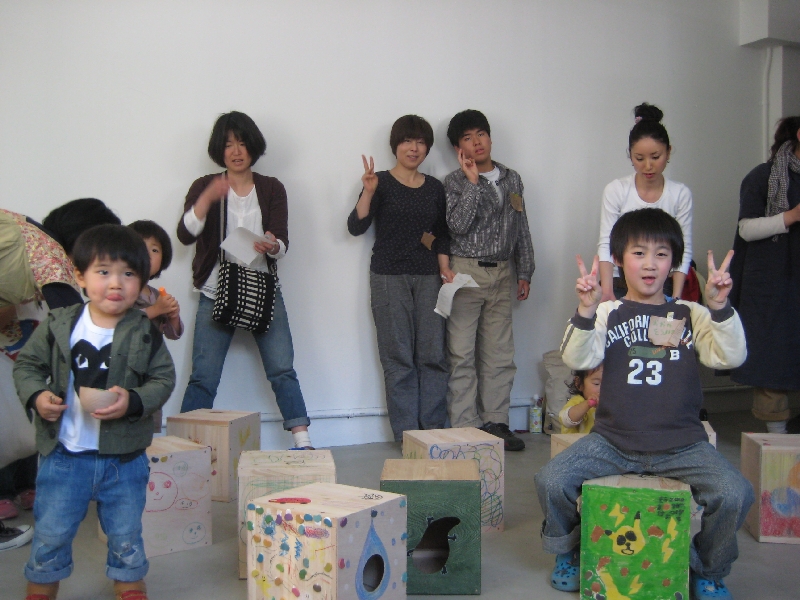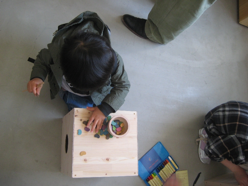 gg*さんという子供向けの木製おもちゃのブランドとのコラボでもあり、ちいさなお子さんが楽しめるように、製作後にクレヨンでお絵かきしたり、gg:*の商品である「マメ」を貼り付けてアートしました。